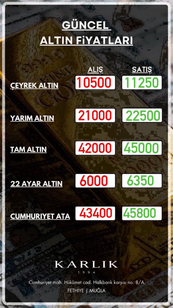 31 Mart 2026 Salı günü Muğla’daki altın fiyatları yatırımcılar tarafından yakından izleniyor. İşte Fethiye Karlık Kuyumculuk’ta güncel altın alış-satış fiyatları: