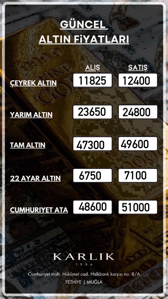 7 Mart 2026 Cumartesi günü Muğla’daki altın fiyatları yatırımcılar tarafından yakından izleniyor. İşte Fethiye Karlık Kuyumculuk’ta güncel altın alış-satış fiyatları: