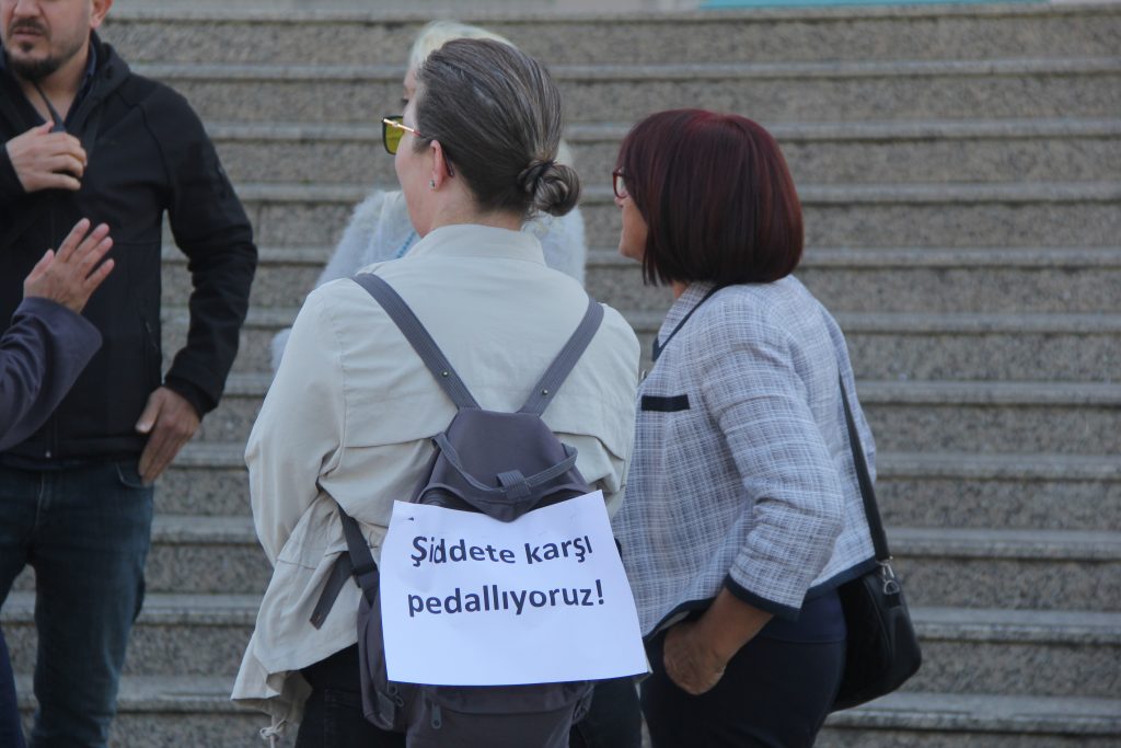 Kadınların bisikletlerinde; “Bir kişi daha eksilmeyeceğiz”, “Şiddetin bahanesi olmaz”, “Şiddeti meşrulaştıran her sessizlik suça ortaklıktır” ve “Şiddete karşı pedallıyoruz” gibi sloganların yazıldığı dövizler yer aldı.