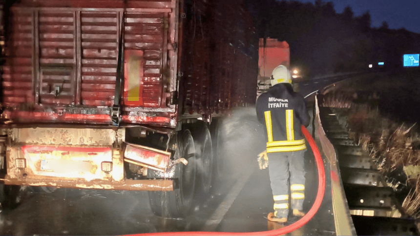 Muğla çevre yolunda seyir halinde olan tomruk yüklü bir tır, lastiklerinde başlayan yangın itfaiye ekiplerinin müdahalesi ile tomruklara ve çevreye sıçramadan söndürüldü.