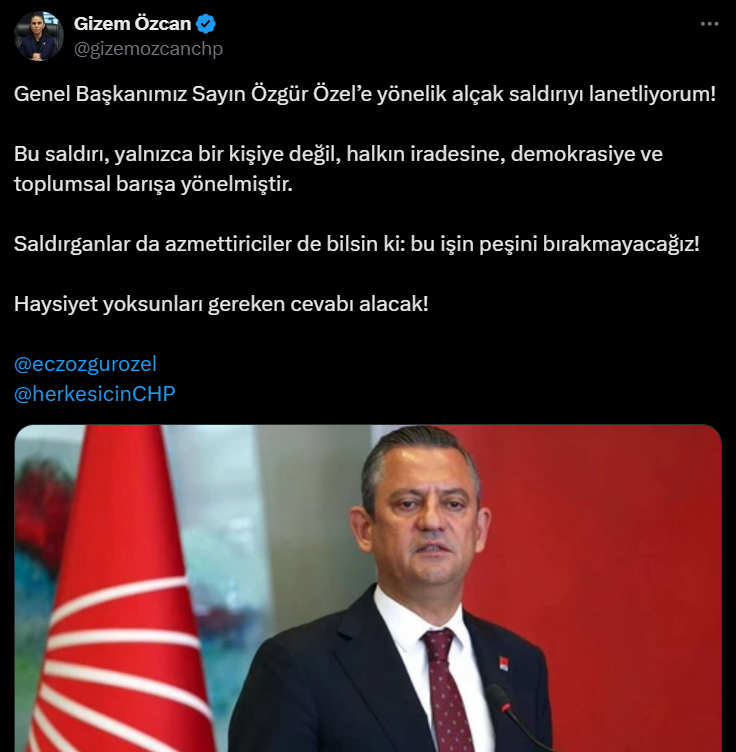 Özgür Özel’e yapılan saldırıyı kınadığını ifade eden CHP Muğla Milletvekili Gizem Özcan, “Bu saldırı, yalnızca bir kişiye değil, halkın iradesine, demokrasiye ve toplumsal barışa yönelmiştir. Saldırganlar da azmettiriciler de bilsin ki: bu işin peşini bırakmayacağız! Haysiyet yoksunları gereken cevabı alacak” dedi.