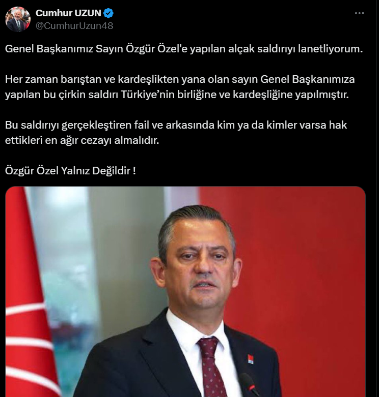 “Her zaman barıştan ve kardeşlikten yana olan sayın Genel Başkanı’mıza yapılan bu çirkin saldırı Türkiye’nin birliğine ve kardeşliğine yapılmıştır. Bu saldırıyı gerçekleştiren fail ve arkasında kim ya da kimler varsa hak ettikleri en ağır cezayı almalıdır. Özgür Özel yalnız değildir!”
