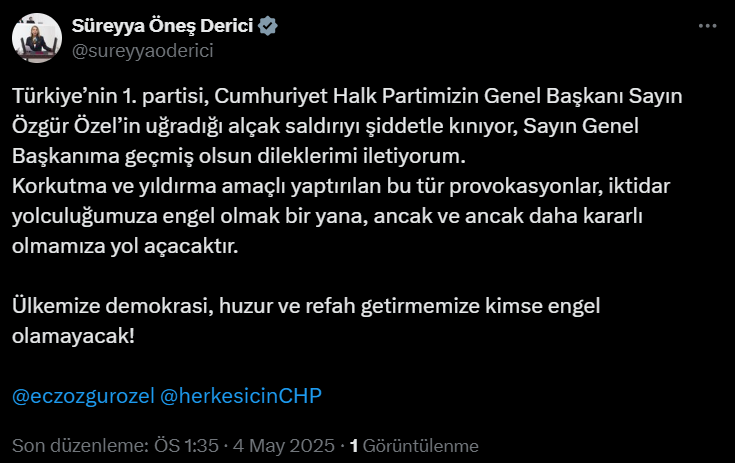 Özgür Özel’e yapılan saldırıyı kınayarak, geçmiş olsun dileklerini ileten CHP Muğla Milletvekili Süreyya Öneş Derici, “Korkutma ve yıldırma amaçlı yaptırılan bu tür provokasyonlar, iktidar yolculuğumuza engel olmak bir yana, ancak ve ancak daha kararlı olmamıza yol açacaktır. Ülkemize demokrasi, huzur ve refah getirmemize kimse engel olamayacak” ifadelerine yer verdi.
