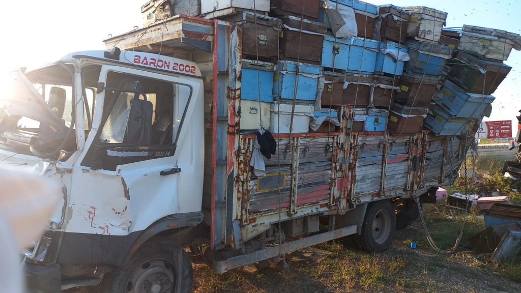Keşan’a bağlı Yerlisu Köyü Kavşağı’nda park eden arı kovanı yüklü kamyona aynı yönden gelen başka bir tır çarptı.