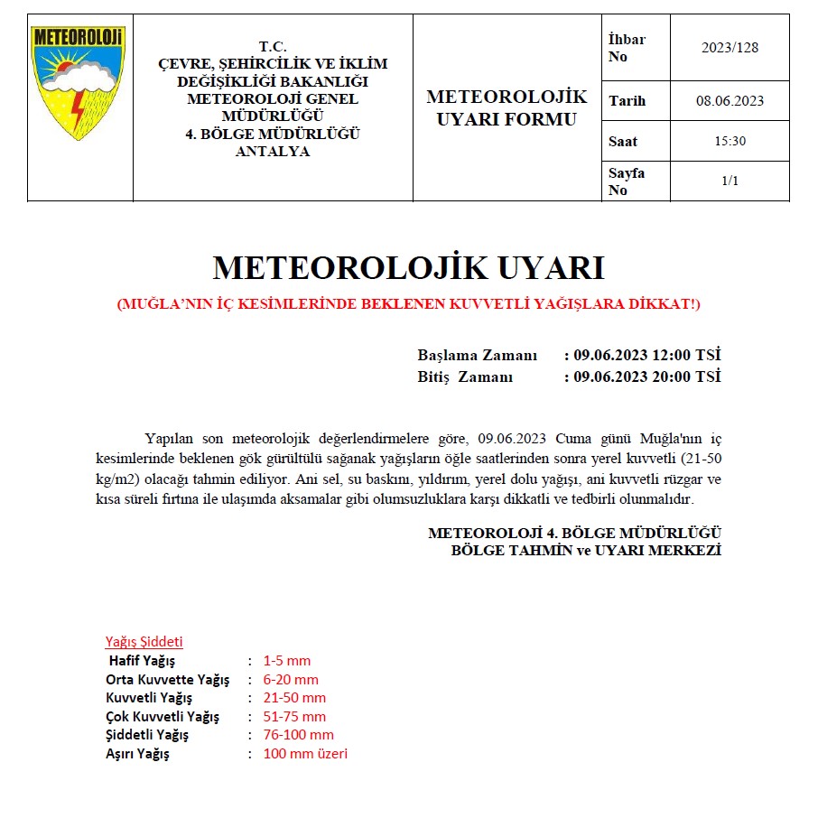 Meteoroloji 4. Bölge Müdürlüğü Bölge Tahmin ve Uyarı Merkezi tarafından yarın (9 Haziran 2023) öğle saatlerinden itibaren Muğla’nın iç kesimleri için yerel olarak kuvvetli sağanak ve gök gürültülü sağanak yağış uyarısı yapıldı.