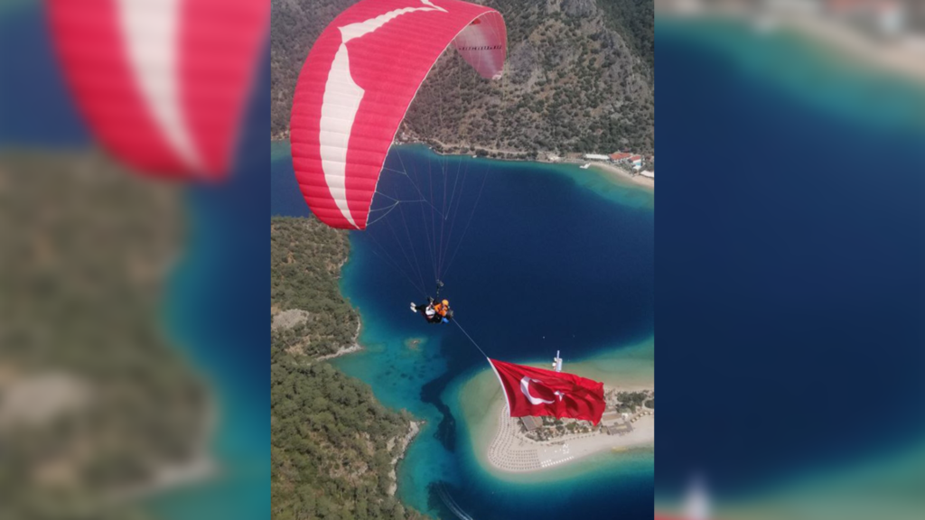 Muğla’nın Fethiye ilçesinde yer alan ve yamaç paraşütü sporuyla dünyaca ün kazanan Ölüdeniz’de, 23 Nisan Ulusal Egemenlik ve Çocuk Bayramı dolayısıyla Ölüdeniz Yamaç Paraşütü Pilotları Kooperatifi üyeleri gökyüzünde Türk bayrağı açtı.