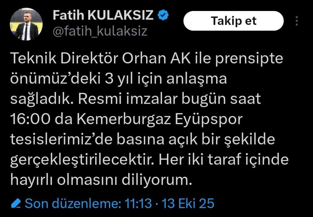 Trendyol Süper Lig ekiplerinden Eyüpspor, teknik direktörlük görevine Ak’ı getirdi. Kulüp asbaşkanı Fatih Kulaksız, sosyal medya hesabından yaptığı açıklamada, “Teknik direktör Orhan Ak ile prensipte önümüzdeki 3 yıl için anlaşma sağladık. Resmi imzalar bugün saat 16.00’da Kemerburgaz Eyüpspor Tesisleri’mizde basına açık bir şekilde gerçekleştirilecektir. Her iki taraf için de hayırlı olmasını diliyorum” ifadelerine yer verdi.