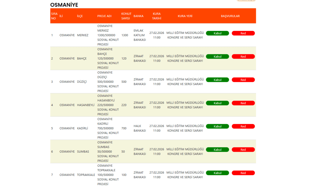 Osmaniye TOKİ kura çekilişi, Osmaniye Milli Eğitim Müdürlüğü Kongre ve Sergi Sarayı’nda noter huzurunda yapılacak.