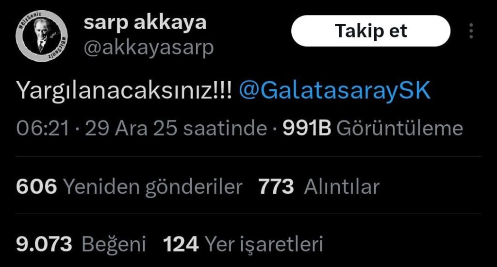 Twitter hesabından Galatasaray’ı etiketleyerek yalnızca “Yargılanacaksınız!!!” yazan Akkaya’nın bu mesajı, futbol camiasında tartışmalara yol açtı.