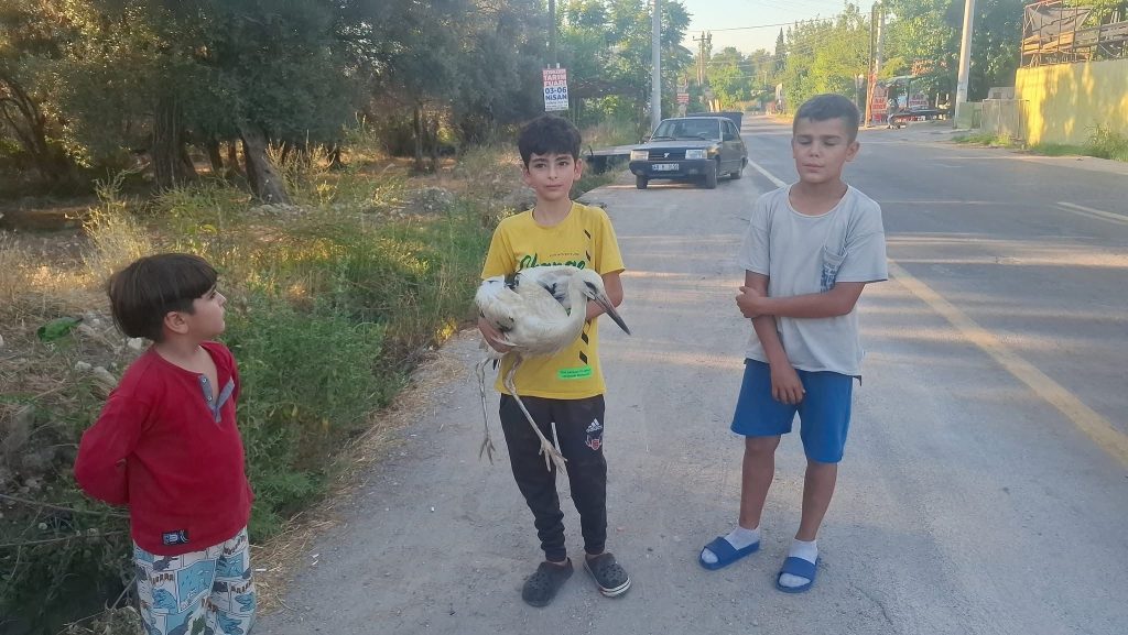 Muğla’nın Seydikemer ilçesine bağlı Güneşli Mahallesi’nde yaşayan üç kardeş, yol kenarında bir leyleğin hareketsiz halde durduğunu fark etti.