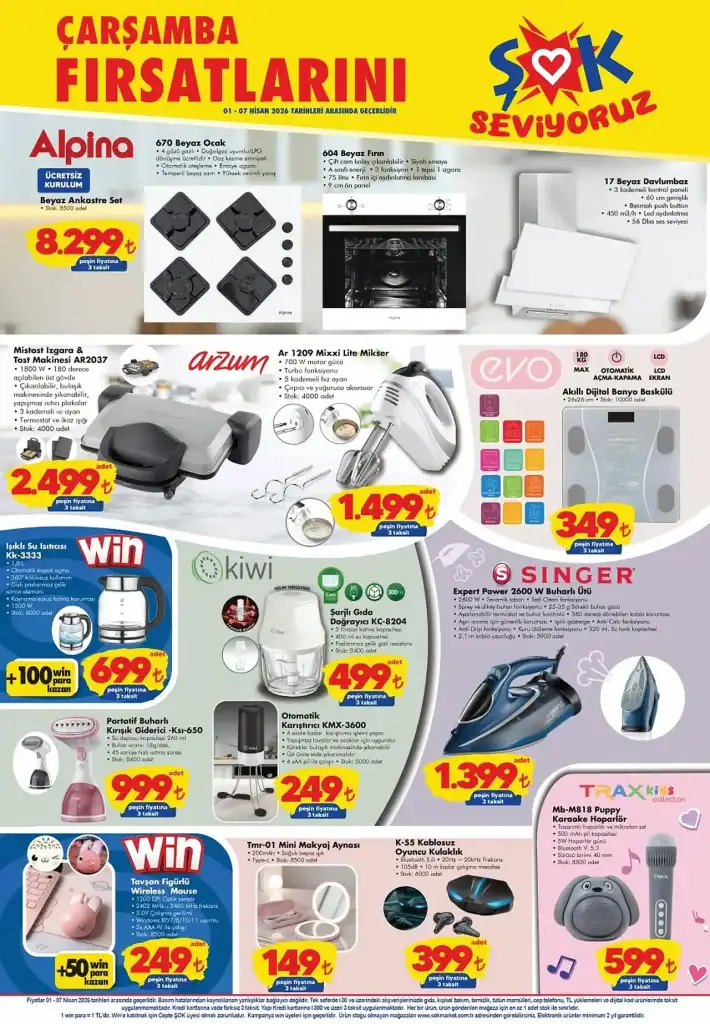 Katalogda Alpina ankastre set 8.299 TL olarak satışa sunuldu. Set içinde ocak, fırın ve davlumbaz yer aldı. Küçük ev aletleri kategorisinde Arzum mikser 1.499 TL, Singer buharlı ütü 1.399 TL ve Kiwi doğrayıcı 499 TL fiyatla listelendi. ŞOK aktüel kataloğu içerisinde ayrıca Win su ısıtıcısı 699 TL ve tost makinesi 2.499 TL olarak duyuruldu.