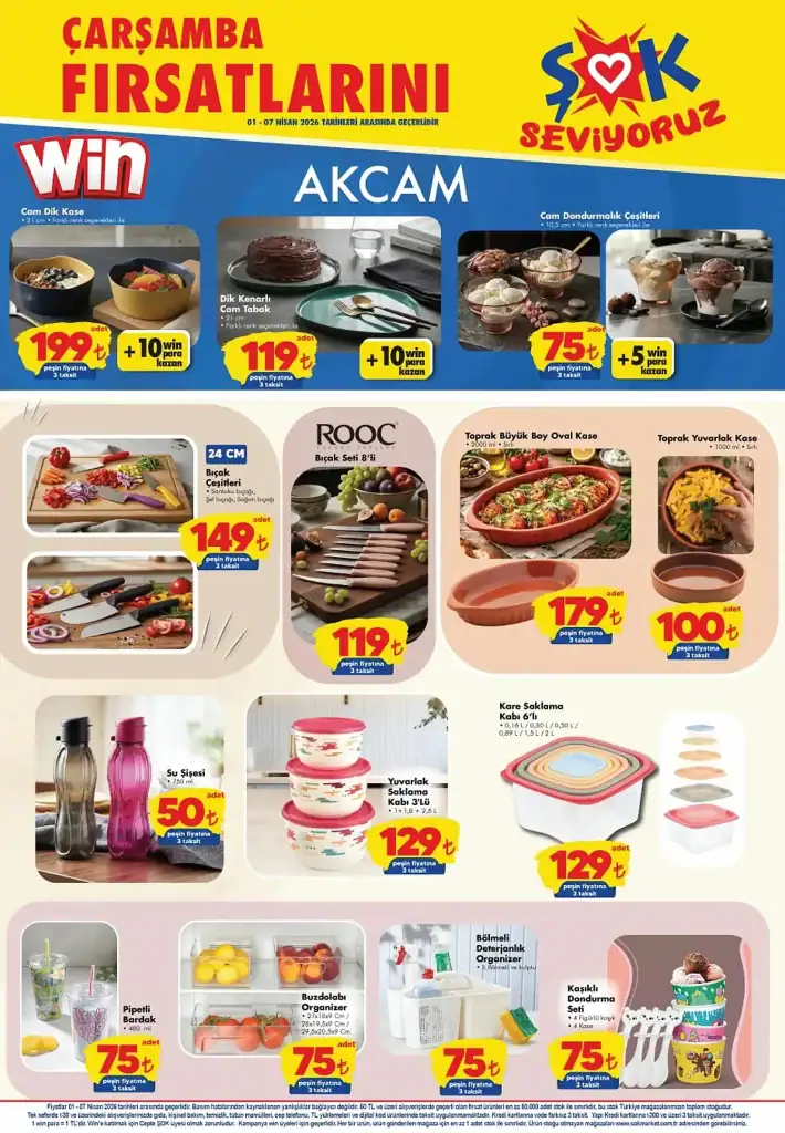 ŞOK aktüel ürünler kampanyasında ayrıca cam kase, saklama kabı, su şişesi ve mutfak gereçleri farklı fiyat seçenekleriyle satışa sunuldu. Kampanya ürünlerinin stoklarla sınırlı olduğu ve mağazalara göre farklılık gösterebileceği bilgisi paylaşıldı.