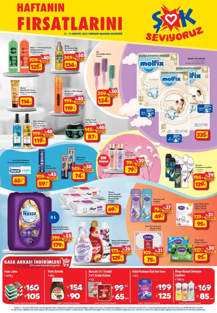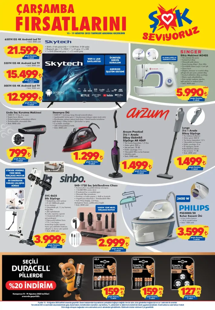 ŞOK’un 13-19 Ağustos 2025 tarihleri arasında geçerli aktüel kataloğunda Skytech markalı televizyonlar, çamaşır makineleri, gıda ürünleri ve kişisel bakım ürünleri öne çıkıyor.