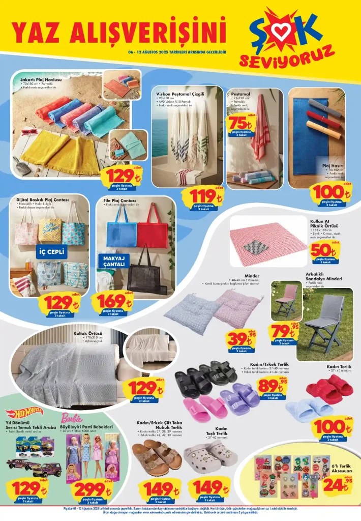Yaz ürünleri arasında plaj havlusu, pestemal, file çanta, plaj minderi, terlik modelleri ve şemsiye örtüsü gibi tekstil ürünleri farklı fiyatlarla sunuluyor.