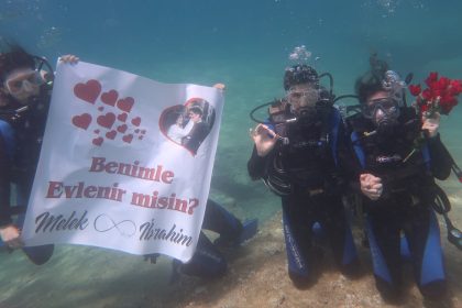 Muğla'nın Fethiye ilçesine tatile gelen bir kişi, kız arkadaşına su altında evlilik…