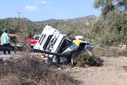 Milas’ta trafik kazası: Tır bariyerlere devrildi