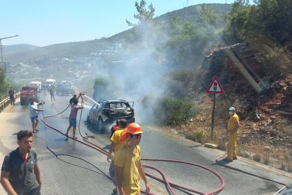 Muğla'nın Bodrum ilçesinde seyir halindeki otomobilde çıkan ve otluk ve makilik alana…