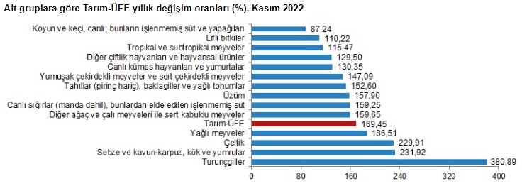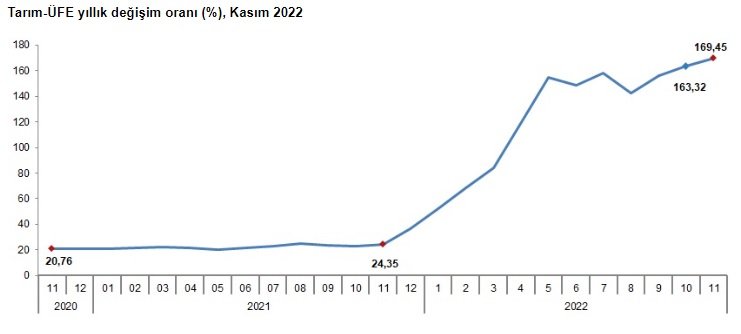 Tarım ürünleri üretici fiyat endeksinde (Tarım-ÜFE), 2022 yılı Kasım ayında bir önceki aya göre yüzde 7,00, bir önceki yılın Aralık ayına göre yüzde 139,49, bir önceki yılın aynı ayına göre yüzde 169,45 ve on iki aylık ortalamalara göre yüzde 122,93 artış yaşandı.