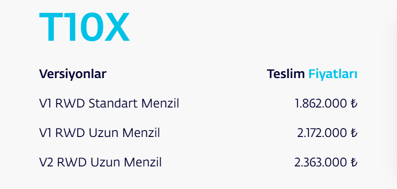 - Togg T10X V2 RWD Uzun Menzil: 1 milyon 830 bin TL
