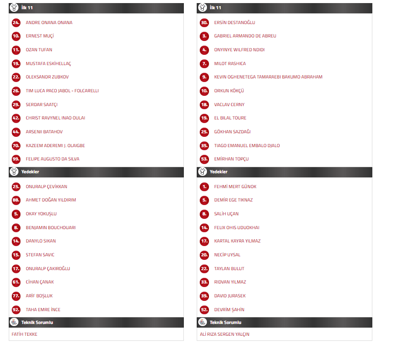 Trabzonspor’da kart cezalıları Pina ve Onuachu karşılaşmada forma giyemeyecek. Sakatlığı nedeniyle TFF’ye bildirilen listede yer almayan Nwakaeme ile ameliyat sonrası tedavileri süren Visca ve Baniya da kadroda bulunmuyor. Sakatlık sürecinin ardından takımla çalışmalara başlayan Savic’in maç kadrosunda yer alıp almayacağı karşılaşma saatinde netleşecek.