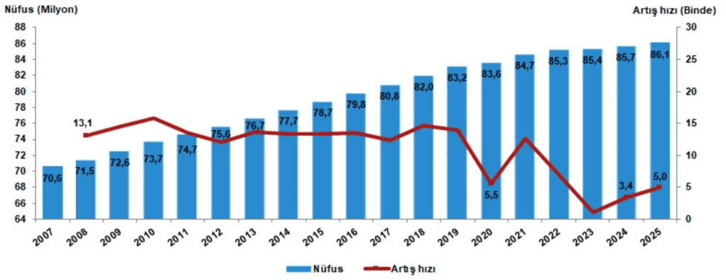 Yıllık nüfus artış hızı 2024 yılında binde 3,4 iken 2025 yılında binde 5 oldu.