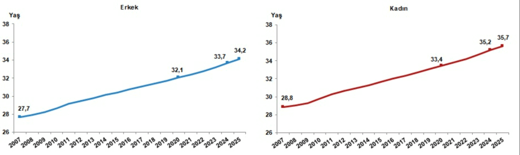 TÜİK verileri, Türkiye nüfusunun yaş yapısında da değişimler yaşandığını ortaya koydu. 2024 yılında 34,4 olan ortanca yaş, 2025 yılında 34,9’a yükseldi. Erkeklerde ortanca yaş 34,2, kadınlarda ise 35,7 olarak hesaplandı.