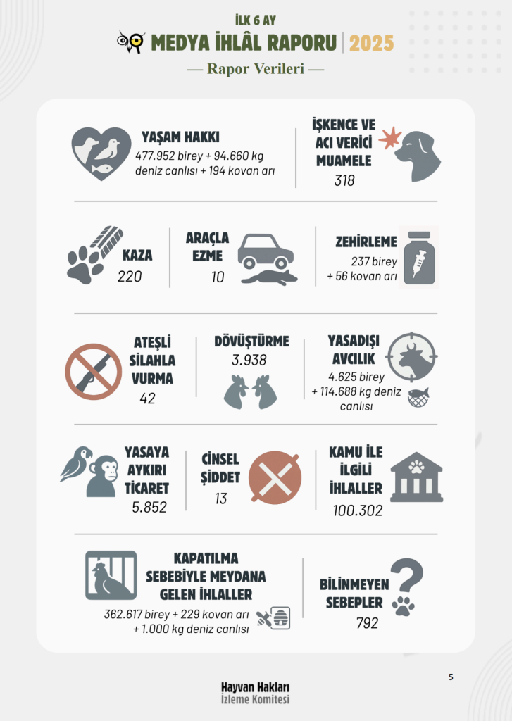 Söz konusu rapora göre, Türkiye’de yılın ilk altı ayında 477 bin 952 birey, 94 bin kilogram (kg) deniz canlısı ve 194 kovan arının yaşam hakkı ihlal edildi. Kapatılma nedeniyle medyana gelen ihlaller ise 362 bin 617 birey, bin kg deniz canlısı ve 229 kovan arı şeklinde gerçekleşti.
