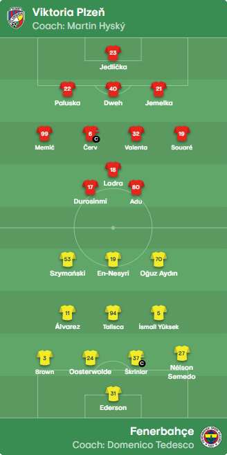 Fenerbahçe, Viktoria Plzen deplasmanında tam kadro yer alacak. Kadro dışı bırakılan İrfan Can Kahveci ve Cenk Tosun dışında UEFA listesine bildirilen tüm oyuncular bu karşılaşmada forma giyebilecek.