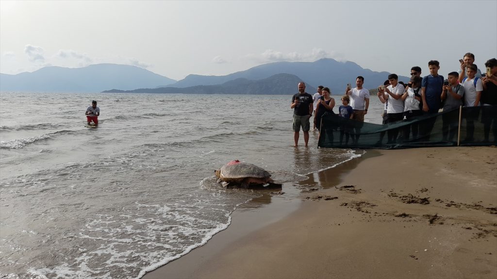 Muğla’nın Ortaca ilçesindeki İztuzu kumsalına yumurta bırakan caretta carettaya uydu takip cihazı takılarak denize bırakıldı.