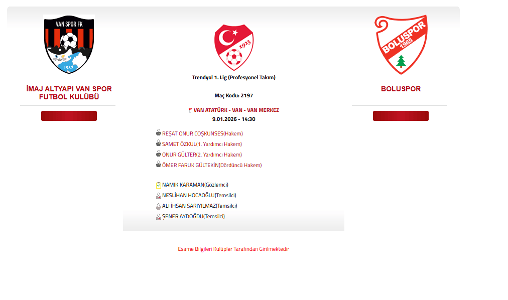 Vanspor ile Boluspor arasında oynanacak karşılaşma 9 Ocak 2026 (bugün) saat 14.30’da başlayacak.