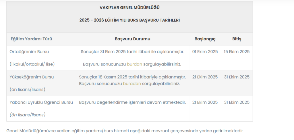 Başvuran öğrenciler, 21 Ekim 2025 – 31 Ekim 2025 tarihleri arasında tamamlanan süreç için sonuç ekranını takip ediyor. Bununla birlikte öğrenciler, burs sonuçlarını sorgularken yalnızca resmi internet adresini kullanarak süreç hakkında güncel bilgi alıyor. Ayrıca Vakıflar Genel Müdürlüğü, değerlendirme sürecine ilişkin açıklamalarını kurumsal sosyal medya hesapları üzerinden paylaşıyor.